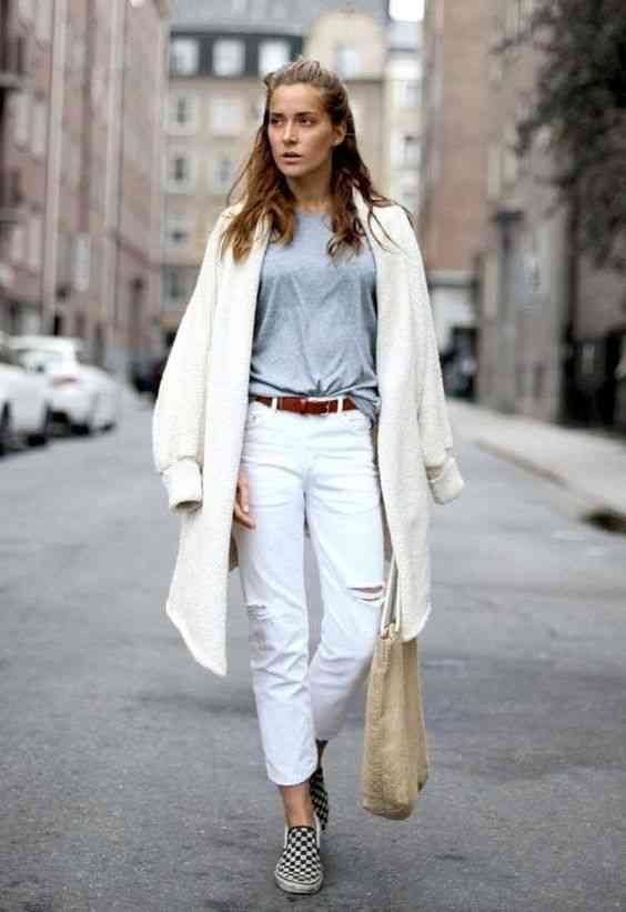 ولا يقتصر البنطلون البوي فريند على الجينز باللون الأزرق، ولكنه يُمكن أن يكون بأي لون مثل هذه الموديل التي اختارت اللون الأبيض، ونسقته مع تيشيرت رمادي بسيط وبالطو أبيض طويل، وحذاء كاروهات بالأبيض والأسود.