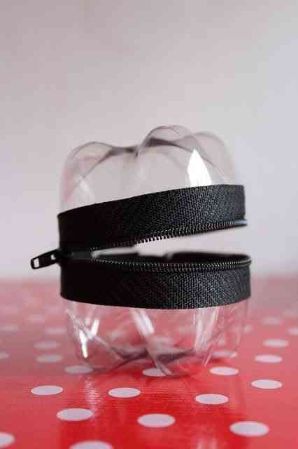 قومي بقص نصف زجاجة بلاستيك أو قص الجزء الأخير منها، ثُم قومي نفس الأمر مع الزجاجة الأخرى. بعد ذلك افتحي السوستة والصقي نصفها في الجزء الأول والنصف الثاني في الجزء الثاني بمساعدة مسدس الشمع. وهكذا تُصبح جاهزة. ويُمكنكِ تغيير لونها باستخدام الألوان ولصق بعض الأشكال إذا أحببتِ.